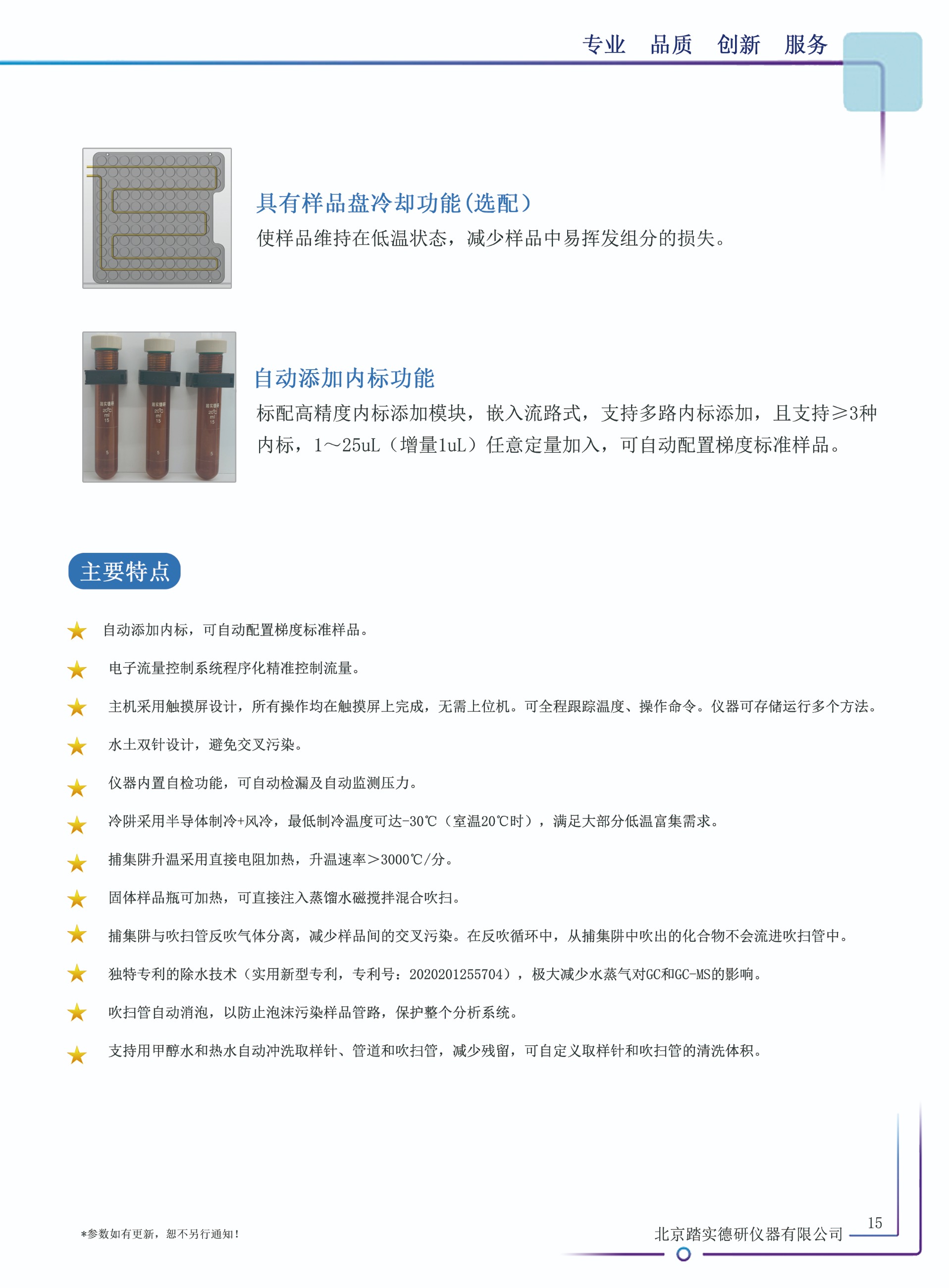PTC-VI型全自動吹掃捕集儀可用于固體或液體樣品中揮發性有機物的檢測,是一款具有116位自動進樣系統的吹掃捕集儀。其具有優越的捕集和除水性能,智能便捷的加標技術不僅能精準的添加內標,還可以自動加標繪制目標物標準曲線。通過與GC或GC-MS的聯用,可以廣泛應用于環境分析,如飲用水、廢水、土壤中的有機污染物分析,也可用于食品中揮發物(如氣味成分)的分析等。該款儀器符合《HJ639-2012水質 揮發性有機物的測定 吹掃捕集/氣相色譜-質譜法》、《HJ686-2014水質 揮發性有機物的測定 吹掃捕集/氣相色譜-質譜法》、《HJ605-2011土壤和沉積物揮發性有機物的測定 吹掃捕集/氣相色譜-質譜法》等標準。